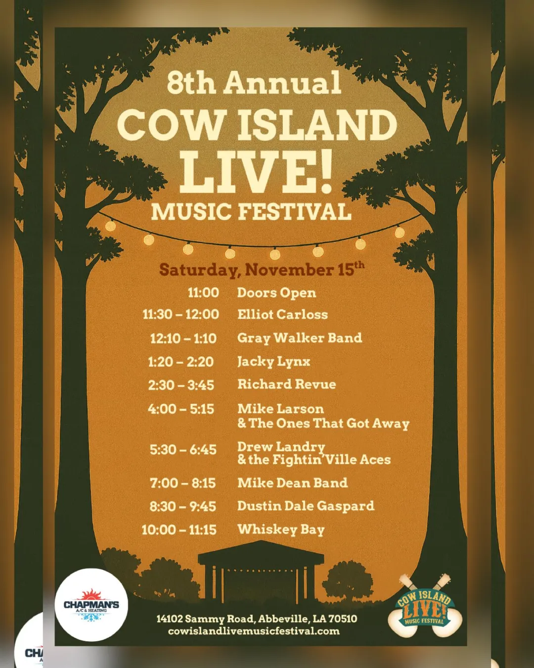If you type in the address 14102 Sammy Rd, Abbeville, LA 70510 or Cow Island LIVE! Google Maps should bring you right here. You can also use our map on our website: Cowislandmusicfestival.com