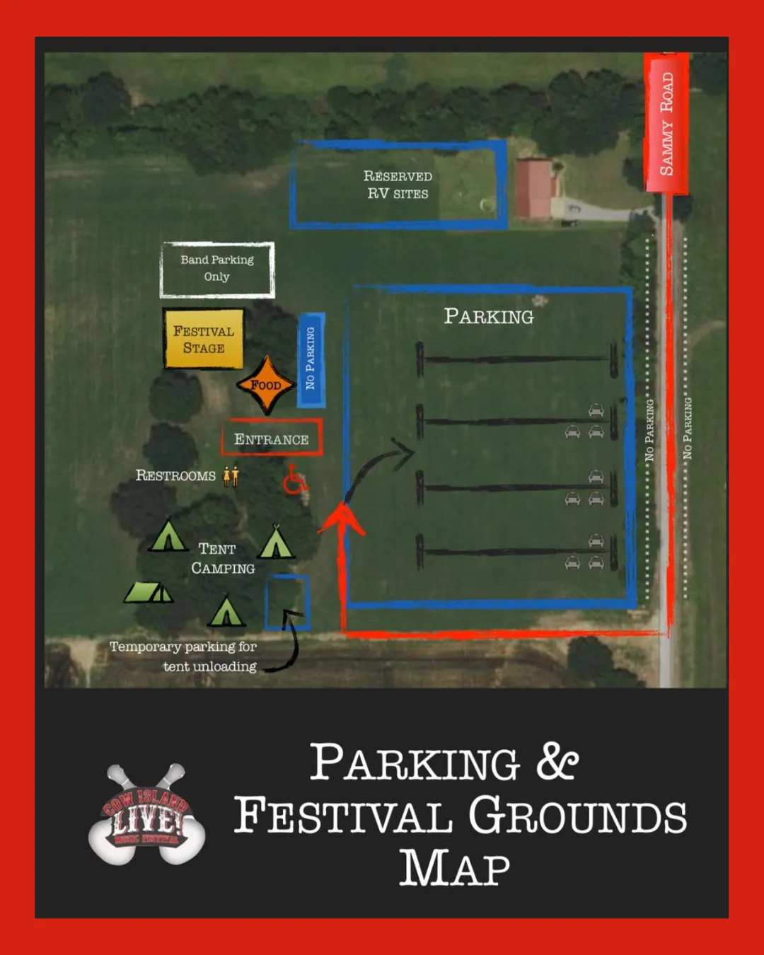 Parking is available in the field. Check the site map for parking instructions. We will have parking attendants to help you park. Please do not park in driveways or on property of our neighbors or along the roadside. We do have handicap parking near the entrance. When leaving please be respectful to our neighbors, drive slow & don’t rev up your engine.